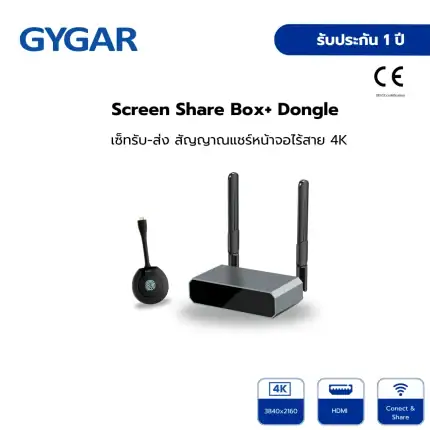 แชร์หน้าจอจากมือถือหรือโน้ตบุ๊กขึ้นจอใหญ่ได้ทันทีแบบไร้สาย ด้วย Dongle รองรับทั้ง USB และ Type-C ใช้งานง่าย ไม่ต้องติดตั้งซอฟต์แวร์ให้ยุ่งยาก ตัวกล่องหลักเชื่อมต่อกับหน้าจอผ่าน HDMI ให้ภาพคมชัดระดับ 4K เสถียร ลื่นไหล ตอบโจทย์ทุกการประชุมและการนำเสนอระดับมืออาชีพ